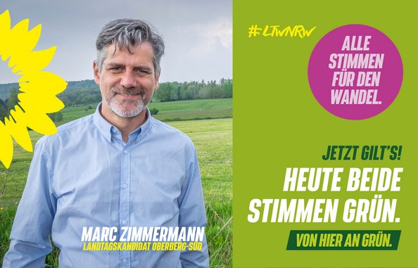 Bei der gestrigen Landtagswahl haben die Wähler:innen mit dem grünen Kandidaten Marc Zimmermann aus Wiehl – Drabenderhöhe erstmals einen grünen Oberberger nach Düsseldorf geschickt. Mit Platz 34 der Reserveliste reichte das Wahlergebnis von 18,2 % für 39 Mandate für B’90/ DIE GRÜNEN im zukünftigen Landtag und damit für einen sicheren Sitz für den Kandidaten und Sprecher unseres Kreisverbands.